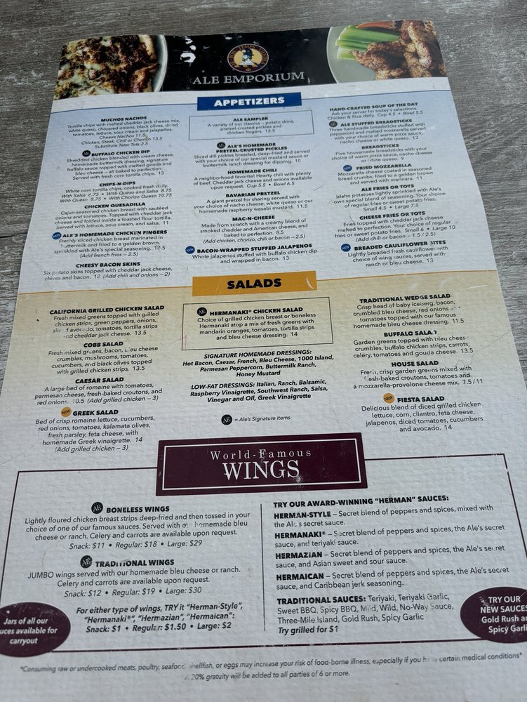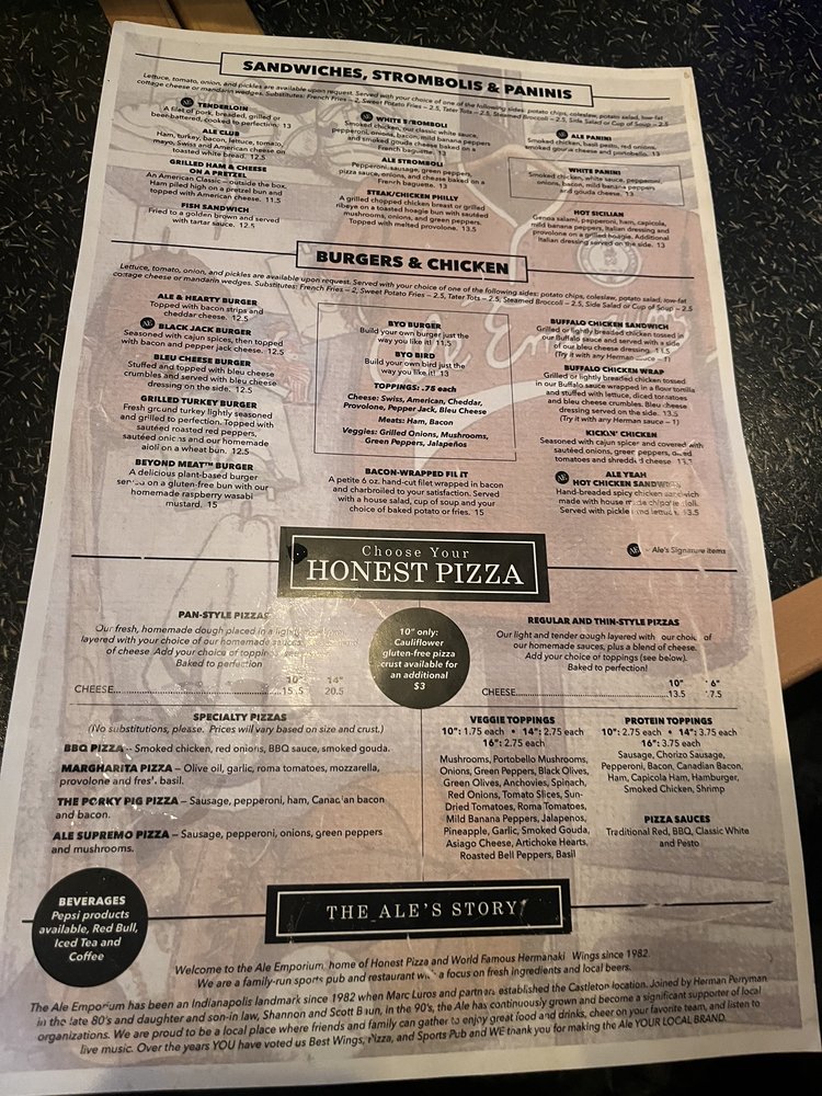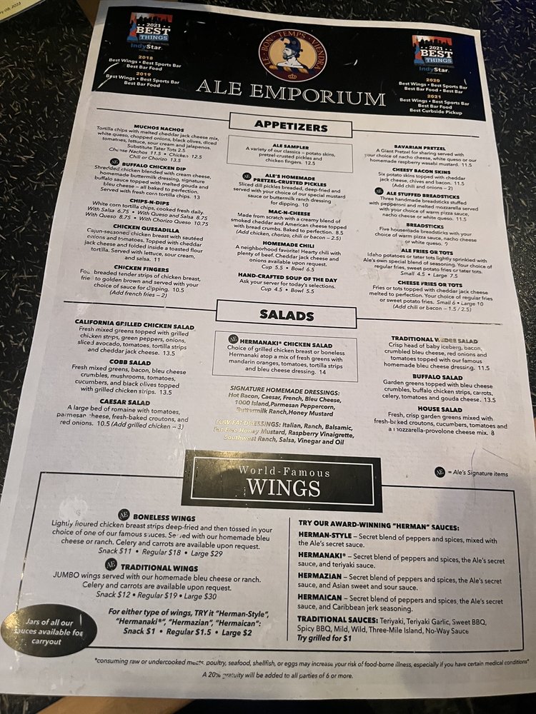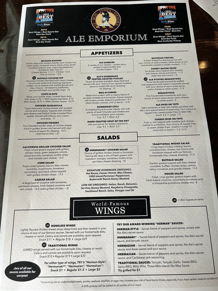 Ale Emporium, located in Indianapolis, is a hidden gem known for its delectable wings and stuffed breadsticks. The menu offers a range of sports bar favorites, including pizza and chicken wings. Customers rave about the flavorful wings and crispy breadsticks oozing with mozzarella. The atmosphere is vibrant, perfect for game nights with multiple TVs and live music. The service can be hit or miss, but the friendly staff makes up for any delays. Must-try items include the Hermaican Wings, pan pizza with smoked Gouda, and tater tots with the Naki burger. Ale Emporium is a great spot for casual dining, offering outdoor seating and a full bar with happy hour specials. Whether you're looking for a relaxed lunch, lively dinner, or late-night bite, Ale Emporium promises a satisfying dining experience.